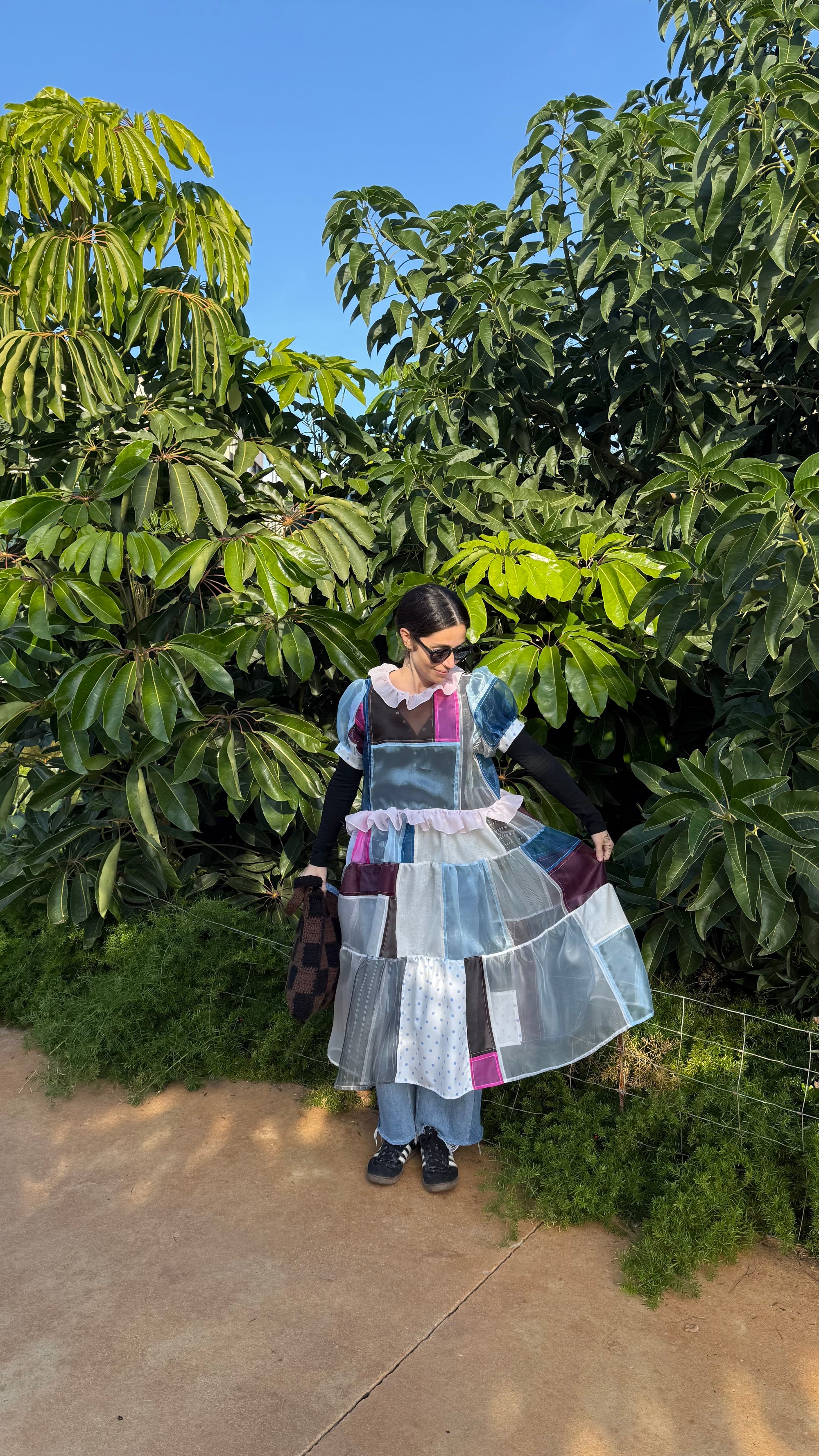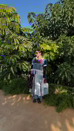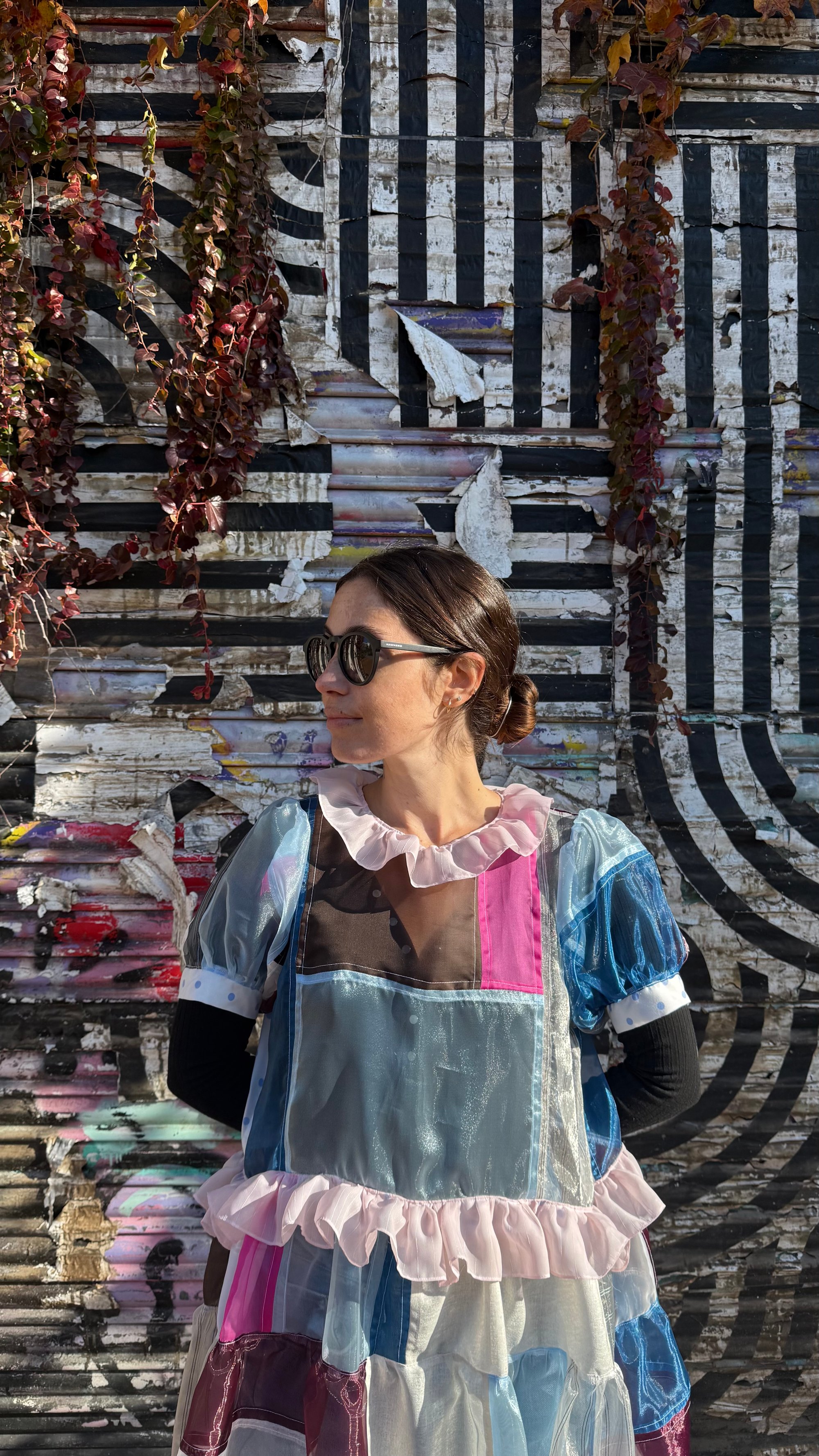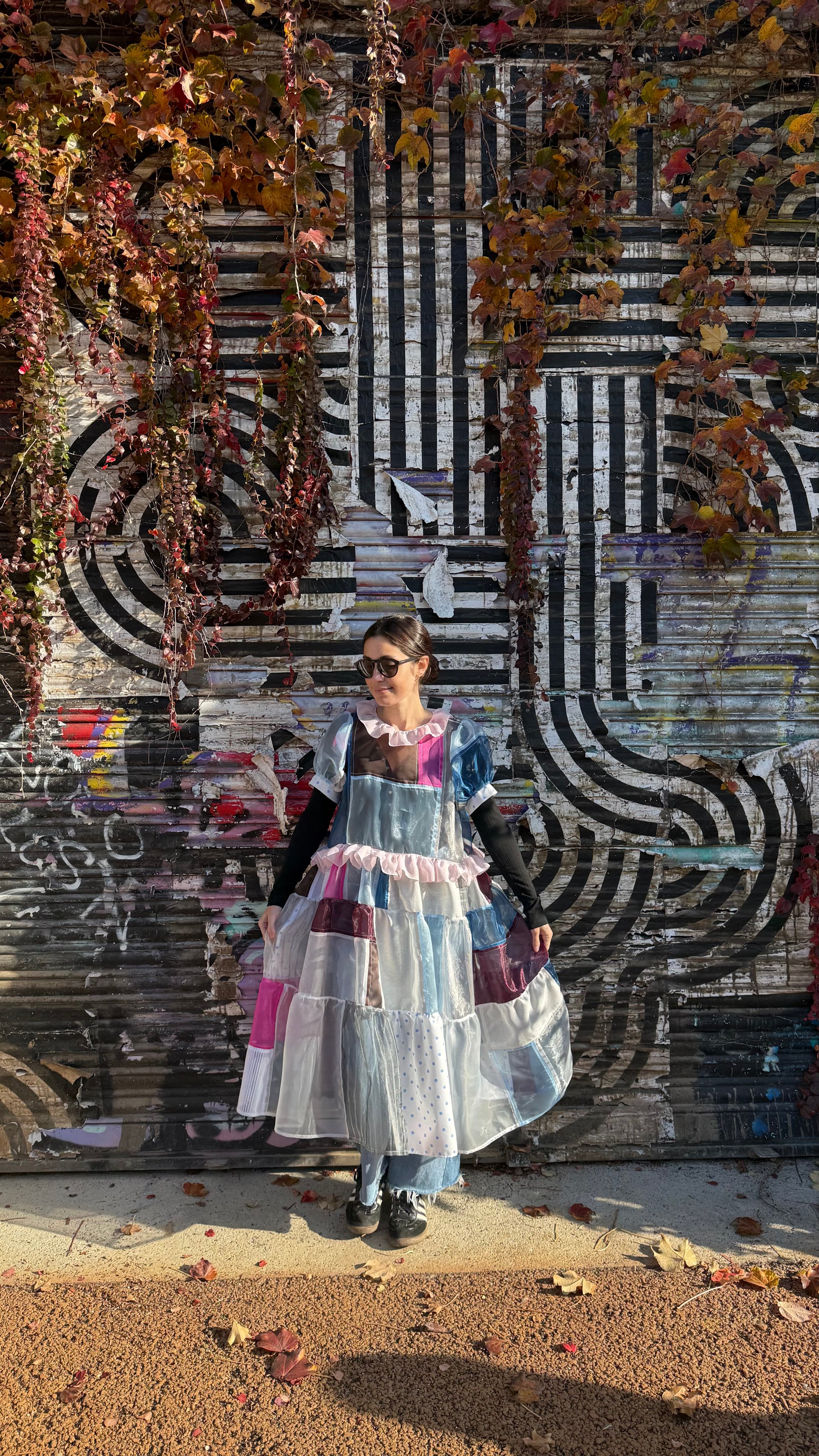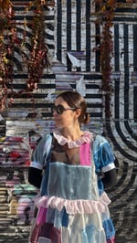 This patchwork dress is made from fabric scraps, deadstock fabrics, and various secondhand fabrics.